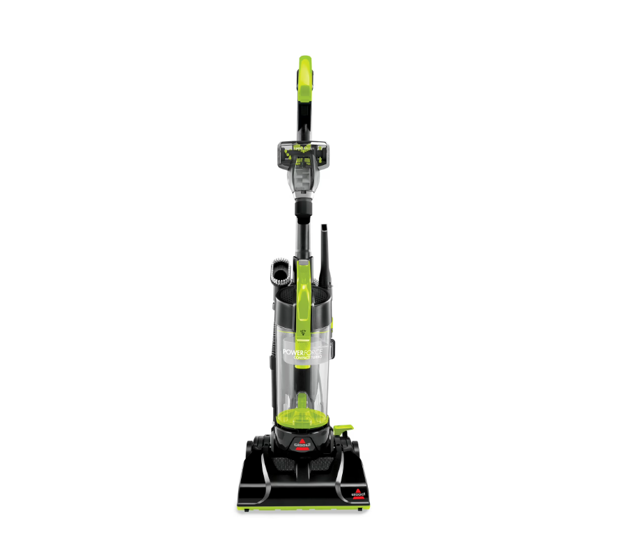 Home / Vacuums / BISSELL PowerForce Compact Turbo VacuumBISSELL PowerForce Compact Turbo Vacuum BISSELL Power Force Compact Turbo Bagless Vacuum Model # 2690 Colour: Green & Black Lightweight, compact design — weighs less than 8 lbs Powerful suction Rotating brush system delivers a deep, thorough clean Bagless design with an easy-to-empty, see-through dirt cup Suitable for multiple floor types — wood, tile, laminate, and more Compact and maneuverable, ideal for tight or hard-to-reach spaces Turbo Brush accessory for carpeted stairs, upholstery, and similar areas High-reach wand for above-floor cleaning Washable filter reduces replacement frequency On-board tool storage for accessories: dusting brush, extension wand, and crevice tool